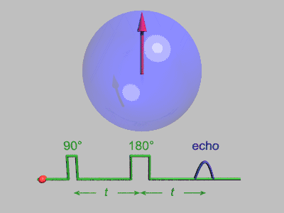 Sekvence spinového echa. A) Vertikální červená šipka znázorňuje průměrný magnetický moment skupiny spinů, např. protonů. Všechny směřují vertikálně ve směru magnetického pole a rotují podél delší osy, zobrazeny jsou v rotující souřadné soustavě, takže jsou stacionární. B) 90° puls sklopí spiny do horizontální (x-y) roviny. C) Vlivem nehomogenit lokálního magnetického pole (změny magnetického pole v různých částech vzorku) dojde ke zpomalení precese některých spinů, zatímco jiné zrychlí. To způsobuje vyhasínání signálu. D) Po aplikaci 180° pulsu dojde k obrácení pořadí. Pomalejší spiny se dostanou před rychlejší. E) Postupně dochází k tomu, že rychlejší spiny se začnou přibližovat k pomalejším. F) Kompletní refokusace nastane v čase T2. Návrat spinů do vertikálního směru (není zobrazeno) nastane v čase . 180° puls se často označuje jako -puls.
