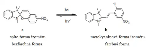 Spiropyranová forma (SP) sloučeniny je bezbarvá na rozdíl od merokyaninové formy (MC), která je barevná. Při izomerizací jde o elektronové přeskupení a vytvoření konjugovaného systému. "Spiro" uhlík v sp3 hybridizaci prochází díky přesunu π elektronů na uhlík v sp2 hybridizaci, který má v prostoru planární uspořádání. Po ozáření světlem vazba mezi "spiro" uhlíkem a kyslíkem zanikne, kruh se otevře a dojde k rotaci aromatické benzenové části.