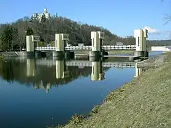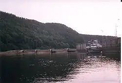 Vojtěch Lanna vplouvá do ochranného přístavu, v pozadí plavební komora a jez České Vrbné -