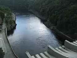 Dokončená plavební komora na VD Hněvkovice – pohled z mostovky na plavební komoru a přehradní hladinu