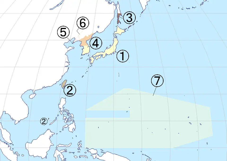 - Japonské souostroví, v letech 1945–1952 pod správou Nejvyššího velitele spojeneckých sil (se dvěma výjimkami: Iwo Jima spravována USA do roku 1968 a Okinawa do roku 1972)
