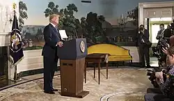 Trump ve svém oficiálním prohlášení řekl: „Oznamuji, že Spojené státy americké dnes odstoupí od jaderné dohody s Íránem. Za pár okamžiků podepíšu prezidentské memorandum, které znovu zavede jaderné sankce vůči íránskému režimu. Zavedeme nejvyšší úroveň ekonomických sankcí. Jakákoli země, která pomáhá Íránu v jeho snaze o získání jaderných zbraní, může být Spojenými státy americkými rovněž sankciována“.[30]