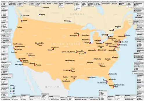 Některé týmy mají název města sousedního státu, sídlí však v uvedeném – např. New York (New Jersey), Washington (Maryland).