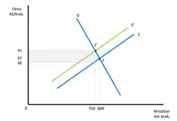 Krabička cigaret stojí 37 Kč a stát chce uvalit 5 Kč/ks spotřební daň. Kdyby cena zůstala stejná, výrobce by přišel o 5 Kč ze zisku. Kdyby se cena zvýšila na 42 Kč, zákazník by zaplatil navíc 5 Kč. Ani jeden z případů se však skutečně nestane. Zdražení cigaret povede i díky substitučnímu a důchodovému efektu ke snížení poptávaného množství. Výrobce tedy musí reagovat snížením ceny k dosáhnutí rovnováhy (viz diagram). Krabička tedy v konečném součtu bude stát méně než 42 Kč. Podle modelového příkladu a diagramu je konečná cena 41 Kč. Stát tímto získá (5 Kč × 750 000 000) 3,75 miliard Kč na spotřební dani, která se na jednu krabičku rozloží mezi zákazníka (4 Kč) a výrobce (1 Kč).[12]
