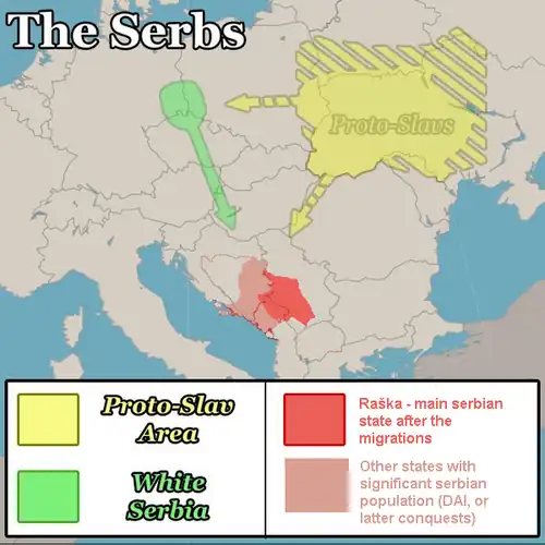 Předkové Srbů začali přicházet na Balkán od 6. století, postupně si podmanili místní romanizované ilyrské a trácké kmeny, které byly před příchodem Slovanů ovlivněny i Vizigóty.