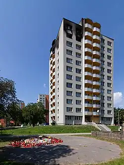 Při požáru panelového domu (na obrázku) v Bohumíně zemřelo 8 dospělých a 3 děti. Policie zadržela jednu osobu pro podezření ze žhářství.[11]