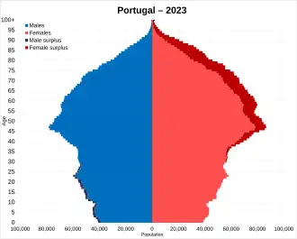 Podle sčítání lidu v Portugalsku v roce 1994 bylo 13,1 % obyvatel starších 65 let. Průměrná délka života Portugalců se od 80. let 20. století do prvního desetiletí 21. století prodloužila o osm let.[38] V roce 2017 tvořili lidé ve věku 60 let a více 27,9 % obyvatel, přičemž podle odhadů vzroste do roku 2050 jejich podíl na 41,7 %.[10] Očekávaná délka života při narození v letech 2010-2015 by měla být 83 let u žen a 77 let u mužů.[10]
