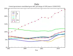 - ↑ CIA. Country Comparison :: Public debt [online]. The World Factbook [cit. 2013-03-27]. Dostupné v archivu pořízeném dne 2007-06-13.