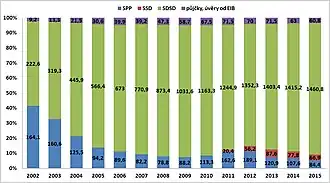 Státní dluh je tvořen státními pokladničními poukázkami (SPP), spořicími státními dluhopisy (SSD), střednědobými a dlouhodobými státními dluhopisy (SDSD), půjčkami a úvěry od Evropské investiční banky. Složení a vývoj státních dluhopisů podle typu instrumentu znázorňuje následující tabulka (údaje v mld. Kč)[23]: