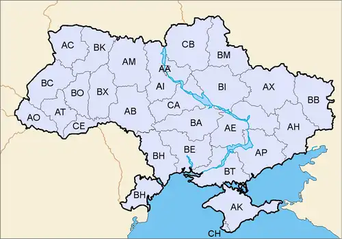 Značky obsahují přesně v pořadí 2 písmena, 4 čísla a 2 písmena. První 2 písmena značí příslušnou oblast. Zbytek kódu se přiděluje podle série. Používají se pouze písmena společná pro ukrajinskou azbuku a latinku – tedy A, B, C, E, H, I, K, M, O, P, T, X (mimo kombinace BP a CC).