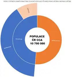 Graf níže zobrazuje podíly pracující a nepracující populace v ČR (cca 10,7mil) a v pracující populaci přibližný podíl veřejných zaměstanců ve volném pojetí(1mil) .