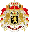 V černém poli zlatý lev s červenou zbrojí, převýšen (štít, nikoli lev!) zlatou královskou korunou červeně podšitou se stříbrnými stuhami se zlatou bordurou a třepením. Za štítem je zavěšen řetěz (kolana) Leopoldova řádu, provázený dvěma zkříženými žezly, pravým s Rukou Spravedlnosti, levým se lvem ze štítu. Deviza: L'union fait la force (Eendragt maekt magt) zlatým písmem na červené stuze černě lemované.