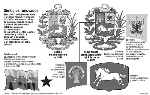 2. února 1999 nastoupil do prezidentského úřadu Hugo Chávez a 15. prosince byl název země změněn na Venezuelská bolívarovská republika. Při svém návrhu na změnu znaku (a tím i vlajky), obhajoval Chávez 20. listopadu 2005 v parlamentu změnu směru cválání koně (kterého původně nakreslil britský diplomat) tím, že „není venezuelský, ale imperialistický“ a běží vpravo, zatímco podle něj historické kresby ukazují, že původním záměrem bylo, aby kůň „cválal svobodně doleva“. Dále se vyjádřil, že kůň vypadá prapodivně, když běží doprava a přitom má krk otočený dozadu. 7. března 2006 schválilo Národní shromáždění zákon č. 423 o státních symbolech. Zákon byl 9. března uveřejněn ve věstníku č. 38.394 a nabyl účinnosti 12. března, v den 200. výročí vztyčení první venezuelské vlajky na lodi generála Mirandy.[1][4]