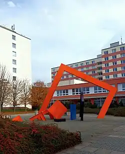 Před budovou školy se v blízkosti bazénku nachází plastika Okna z roku 1991 od Zdeňka Makovského a Aleny Hrošové.[23] Plastika je symbolem školy a škola jí využívá ve svém logu.