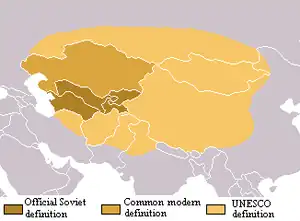 Kulturní vymezení Střední Asie je například podle definice UNESCO širší – má se jednat o oblast, kde je u místních národů patrná jejich historicko-kulturní sounáležitost. Podle UNESCO patří do Střední Asie Mongolsko (Vnitřní i Vnější), Sin-ťiang, Tibet, středoasijské republiky bývalého Sovětského svazu, východní Írán, severní Afghánistán a severozápadní Indie.