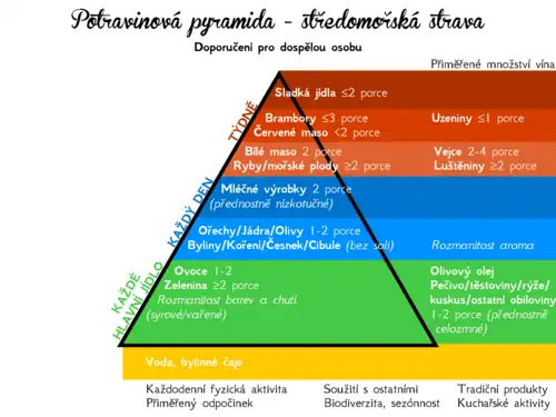 - ↑ WILLETT, W C; SACKS, F; TRICHOPOULOU, A; DRESCHER, G; FERRO-LUZZI, A; HELSING, E; TRICHOPOULOS, D. Mediterranean diet pyramid: a cultural model for healthy eating. S. 1402S–1406S. The American Journal of Clinical Nutrition [online]. 1995-06-01. Roč. 61, čís. 6, s. 1402S–1406S. Dostupné online. doi:10.1093/ajcn/61.6.1402S. PMID 7754995. (anglicky)
