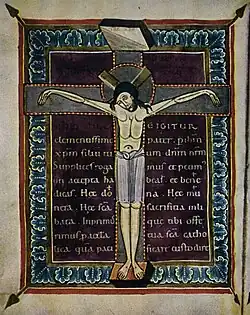 Miniatura ukřižovaného Krista v německém rukopisném sakramentáři z 11. století