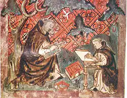 Frater Rufillus zachytil sám sebe na iluminaci při práci ve skriptoriu (Weißenauer Passional, mezi 1170 a 1200)