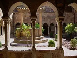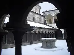 Dvůr (zahrada) uprostřed budov obsahoval tzv. viridarium (také rajský dvůr), obdélnou plochu trávy často obklopenou sloupořadím nebo arkádami. Sloužil především jako útočiště, místo 'vita contempliva'[L 1]. Viridarium bylo čtvrceno cestou (pravoúhle) a často v jejím středu stojí kašna (viz symbolika), která slouží jako hlavní zdroj vody pro mytí a zavlažování. Některé klášterní zahrady obsahují malé rybníky i jiný zdroj potravy pro komunitu. Arkády kolem dvora byly použity pro výuku, posezení a meditaci, nebo pro cvičení v nepříznivém počasí. Rajský dvůr, viridarium, je obdobou římského peristylu.