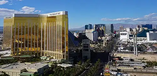 ![]() Vlevo plocha na níž byl pořádán country festival Route 91. Vpravo je hotel Mandalay Bay, z kterého pachatel střílel do davu návštěvníků koncertu. | |