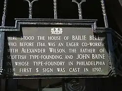 Dle informační desky na budově místního knihkupectví: na tomto místě stával dům pana Bella, který byl (před rokem 1744) horlivým spolupracovníkem těchto dvou mužů: 1. Alexandra Wilsona, zakladatele skotského odlévání tiskárenských typů a 2. Johna Baina, jehož slévárna ve Philadelphii poprvé na světě, v roce. 1797, odlila symbol amerického dolaru ($)