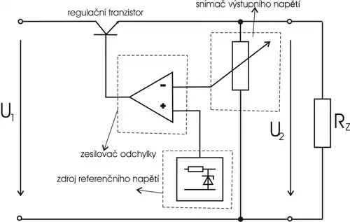 Operační zesilovač odchylky zesiluje rozdíl mezi referenčním napětím a částí výstupního napětí. Výstup zesilovače odchylky budí sériový regulační tranzistor, sníží-li se výstupu napětí, například při vyšší zátěži, zvýší se regulační odchylka, regulační tranzistor je buzen větším napětím. Jeho vnitřní odpor se zmenší a napětí na výstupu se zvětší.