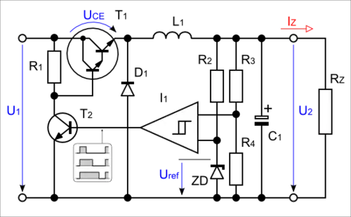 Pro generování spínacích impulsů je používán princip pulsně šířková modulace (PWM), kdy parametrem je napěťová odchylka. Přesnost stabilizovaného napětí v uvedeném zapojení závisí na hysterezi komparátoru. Čím menší bude hystereze, tím častěji bude tranzistor T1 spínán a výstupní napětí bude stabilnější. Při vysoké frekvenci spínání tranzistoru může dojít k jeho „pískání“. Spínaný stabilizátor pro svoji funkci nutně potřebuje trvale připojený kondenzátor, ve kterém se hromadí energie dodávaná spínacím tranzistorem, a působí jako filtr.
