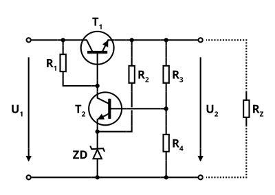 T1 výkonový regulační tranzistor v zapojení emitorového sledovače; R1 budící odpor báze T1; R2, ZD zdroj referenčního napětí; R3, R4 odporový dělič stabilizovaného napětí zpětné vazby; T2 zesilovač odchylky; RZ zátěž stabilizátoru.