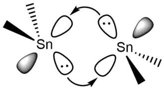 Objemnější stannyleny, například Lappertův stannylen, oproti tomu vytvářejí dimery. Vlastnosti vazeb Sn-Sn u těchto dimerů se liší od vazeb C-C v dimerech karbenů, jako jsou alkeny. Alkeny obsahují typické dvojné vazby a jejich molekuly jsou rovinné, zatímco dimery stannylenů mají molekuly s ohnutým tvarem. Dvojné vazby v dimerech stannylenů lze považovat za dvě donor-akceptorové vazby. Analýza elektronové lokalizační funkce zde ukazuje u obou atomů Sn elektrony ve vazebných orbitalech, což naznačuje, že interakce mezi atomy Sn jsou dvojicí neobvykle ohnutých vazeb.[11] Stabilitu dimerů stannylenů také ovlivňuje sterické odpuzování jednotlivých substituentů.[12]