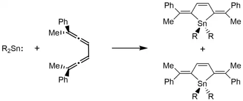 I když jsou stannyleny stabilnější než jejich lehčí karbenové analogy, tak snadno vstupují do [2+4] cykloadičních reakcí se Z-alkeny. Adice (CH(SiMe3)2)2Sn na 2,7-difenylokta-2,3,5,6-tetraen probíhá cheletropně, protože takový průběh umožňují Woodwardova-Hoffmannova pravidla.[14]