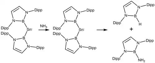 Vlastnosti páru SnII/SnIV u některých stannylenů připomínají přechodné kovy. Na jejich reaktivit v oxidačních adicích má velký vliv energie oddělení singletu od tripletu,[15] kde vytváří silný σ-donorový borylový (-BX2) ligand. Na cín lze oxidačně adovat nejen molekulární vodík. ale i vazby E-H bond (E = B, Si, O, N). U amoniaku a vody může produkt oxidační adice vstoupit do redukční eliminace, kterou vzniká vazba O-B nebo N-B.[16]
