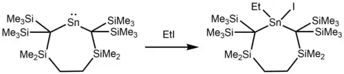 - ↑ a b Colin Eaborn; J. David Smith. Reactions of a Highly Crowded Cyclic Stannylene with Iodoalkanes, Enones, and Dienes. Inhibition of Nucleophilic Substitution at Tin(IV) Centers. Organometallics. 2002, s. 2430–2437. doi:10.1021/om020106y.