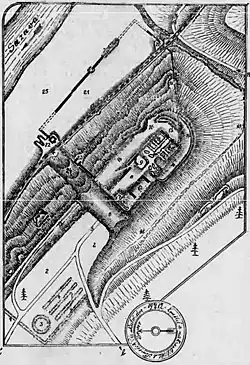 ![]() Severovýchodní zeď druhého nádvoří se zbytky brány a kaple | |