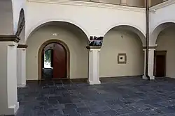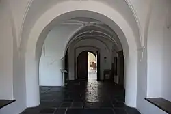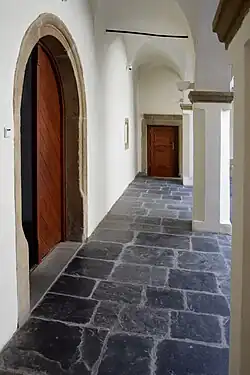 Síň v prvním patře umožňovala vstup do malé věžní místnosti, arkádové chodby, jídelny a na protější straně do pokojů, řazených za sebou ve stylu enfilády. Původně měly trámové záklopové stropy a některé byly navíc přístupné z arkádové chodby pískovcovými portálky.[4]