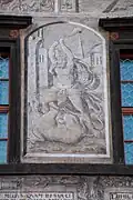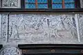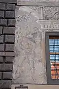 Stará radnice, sgrafito s jelenem na venkovní stěně pod schodištěm, symbol znovuzrození a Ježíše Krista (legenda o sv. Eustachovi) -