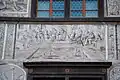V přízemním pásu se nachází pět vzájemně oddělených obrazových polí. Zcela vlevo od kamenné bosáže se nachází první výjev s postavou muže s plnovousem ve vojenském obleku, který ukazuje prstem směrem k zemi. Za oknem stojí další postava muže s turbanem na hlavě, šavlí u pasu a kopím v pravici. Muž je obrácen směrem k vstupnímu portálu, jedná se tedy o strážce vchodu do radnice. V pozadí obrazu je průhled na město. Napravo od portálu se nachází další obrazového pole, na něm se opět obrací další ozbrojený muž ve zbroji a s přilbicí ke vstupnímu portálu, jde o dalšího strážce vchodu do radnice. Jako grafické předlohy pro zobrazení postav vojínů byly použity grafické listy, pocházející z Bible, vydané ve Frankfurtu v roce 1564 ve velkém formátu a s latinským textem a poté znovu v roce 1571 v menším formátu německy, nakladatelem Sigmundem Feyerabendem a jejichž autorem byl Jost Amman na základě kreseb Johanna Melchiora Bocksbergera. Konkrétněji, vojín s přilbou po pravé straně portálu byl vytvořen podle postavy Davidova druha Abizaie (I. REGUM XXVI.)[22], pro zobrazení levého strážce bylo jako vzor použito postavy Nehemiáše (NEHEMIAE IIII.).[23][11] Postava zcela vlevo pak vykazuje podobnost s grafickým listem Josta Ammana, zobrazující buď Kenaana nebo Boha, žehnajícího Noemovi a jeho potomkům, Hospodin zde Noema a jeho potomky vyzývá k dodržování božích zákonů na Zemi a varuje je před vzájemnými rozepřemi (GENESIS IX.[24]). Grafický list pochází z knihy Neuwe biblische Figuren des Alten und Neuwen Testaments (Sigmund Feyerabend, 1564). Gesto ruky tak pravděpodobně upozorňuje na význam dodržování základních božích zákonů na Zemi pro stabilitu lidské společnosti a pravděpodobně také směřuje i k základnímu kameni radnice, jako symbolu stability právního systému v obci.