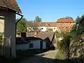 Areál hospodářského dvora s farou (vpravo) ve Starém Kníně (pohled od východu)