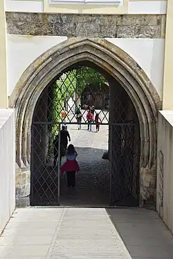 Portály v gotickém paláci mají několik podob. Portálem staršího typu je profilovaný portál s trojlaločným zakončením nahoře. Mezi jednotlivými místnostmi lze nalézt portály pravoúhlé se zkosenými hranami. Portály jsou zkoseny buď z jedné nebo z obou stran. Pokud je zkosení jen z jedné strany, potom je na straně, kudy se vchází do té významnější z obou místností. Vstupní portál s edikulou je z období pozdní gotiky, má sloupy s tordováním (šroubovité tvarování dříku) a s hlavicemi s vegetativním vzorem, s tympanonem a římsou. Dalším typem je sedlový portál – některé z těchto portálů mají i postranní bohatou profilaci.