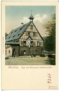 Úprava starého mlýna na kuchyň a hostinské pokoje, stejně jako realizace nové stavby s restaurací, se uskutečnily podle projektu chebského stavitele Carla Haberzettla. Projekt novostavby byl vypracován v tzv. egerlandském stylu, tj. ve formě chebského hrázděného statku, podle reálného a dodnes stojícího hrázděného mlýna Gahmühle ze 17. století ve vsi Salajna poblíž Chebu. Stavební práce probíhaly v letech 1898–1899 pod vedením karlovarského stavitele Emmanuela Grimma. Vrchní dozor nad stavbou vykonával střelecký poručík Rudolf Richter.[1][2][6]