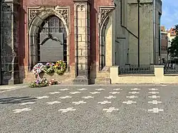 27 bílými kříži bylo v rámci opravy Staroměstské radnice po druhé světové válce označeno místo kde bylo roku 1621 popraveno 27 českých pánů v dlažbě před radniční věží, kde stálo popravčí jeviště.[1] Nedaleká pamětní deska na zdi se jmény popravených je z roku 1911. Umělecká skupina Ztohoven přidala 20. června 2011 ještě 28. kříž.[2] Kříž byl 24. června 2011 odstraněn. V roce 2021 se však kříž na stejné místo znovu vrátil.