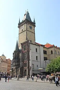 Na jihozápadní straně Staroměstského náměstí se nachází Staroměstská radnice s Orlojem. Ten vytvořil na počátku 15. století hodinář Mikuláš z Kadaně podle návrhu Jana Šindela a roku 1490 ho upravil hodinář mistr Hanuš. Samotná radnice je vystavěna v gotickém slohu s kruhovými okny a lomenými oblouky.