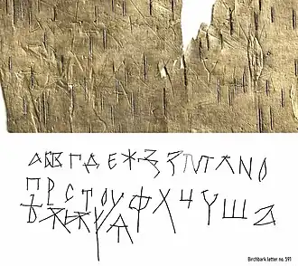 Pro zápis jazyka se používala výhradně cyrilice.[26] Literární památky psané hlaholicí na území Kyjevské Rusi nalezeny nebyly, dochovaly se však hlaholské graffiti a jejich zlomky (např. v novgorodském chrámu sv. Sofie).[27]