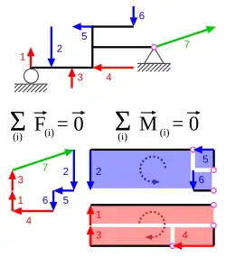 Příklad nosníku v rovnováze, suma sil i momentů je rovna nule