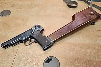 Hledí je stavitelné od 25 do 200m. Zbraň se nosí v dřevěném (nebo umělohmotném) pouzdře, které také plní funkci nástavné pažby. Ve výjimečných případech je možné z pistole střílet dávkou přímo z rukou tj. bez pažby.