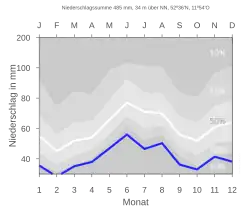 Roční úhrn srážek je extrémně nízký a činí 485 mm. Pouze 2 % měřicích stanic Německé meteorologické služby registruje nižší hodnoty. Nejsušší měsíc je únor, nejčastější srážky se vyskytují v červnu, a to dvakrát více než v únoru. Srážky minimálně kolísají a jsou rozděleny stejnoměrně během celého roku.