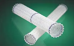 | Stenty z umělých hmot | Jedná se o alternativu ke kovovým stentům. Nejčastějším materiálem je polymer kyseliny mléčné. Díky využití tohoto materiálu se stent v organizmu samovolně rozpouští. Obvyklá doba rozpuštění stentu se pohybuje okolo 24 měsíců od implantace. Od implantace se stent neustále roztahuje a tím pádem by po jeho rozpuštění měla zůstat daná struktura průchozí. Velké využití mají tyto stenty u dětí, u nichž by během růstu mohlo dojít k uvolnění stentu. | ![]() |