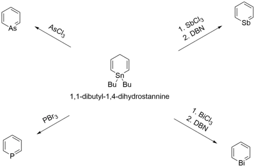 Další deriváty benzenu s jedním uhlíkem nahrazeným atomem prvku 15. skupiny lze získat podobnými postupy jako stibinin. Reakcemi 1,1-dibutyl-1,4-dihydrostanninu s chloridem arsenitým, chloridem fosforitým a chloridem bismutitým vznikají arsabenzen, fosforin, případně 1-chlor-1-bismacyklohexa-2,5-dien. 1-chlor-1-bismacyklohexa-2,5-dienu se zásadou, například 1,5-diazabicyklo(4.3.0)non-5-enem, se utvoří bismabenzen.[3]