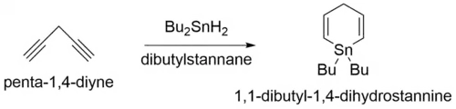Druhým krokem je reakce vzniklého 1,1-dibutyl-1,4-dihydrostanninu s chloridem antimonitým za tvorby 1-chlor-1-stibacyklohexa-2,5-dienu.[2]