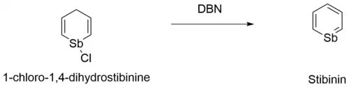 V závěrečném kroku reaguje 1-chlor-1-stibacyklohexa-2,5-dien se zásadou, jako je například 1,5-diazabicyklo[4.3.0]non-5-en (DBN), a vytváří se stibinin.