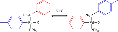 Bylo zjištěno, že i při teplotách okolo 50 °C se mohou vyměnit arylové skupiny na palladiu a koordinovaném fosfinu. I když obvykle nejsou zaznamenány, tak mnohdy mají potenciál vytvořit menšinové produkty.[10]
